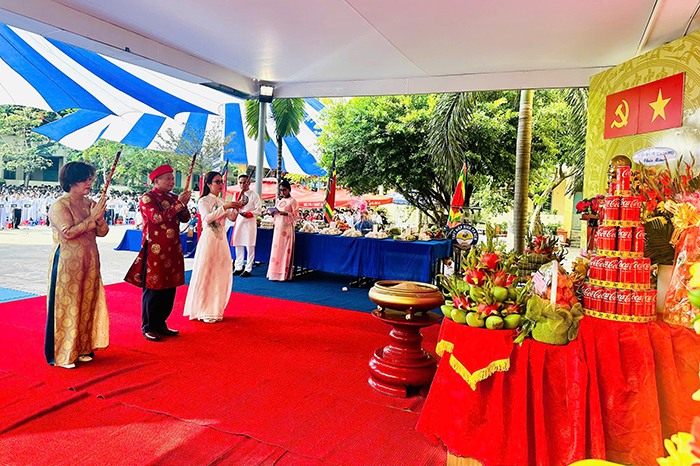 Bày tỏ lòng tri ân sâu sắc, cô Ngọc Anh cho biết, tập thể thầy và trò nhà trường tham dự buổi lễ với tất cả niềm tự hào và tinh thần hướng về cội nguồn dân tộc. Trong không gian linh thiêng, mỗi người đều xúc động khi lắng nghe “tiếng vọng của hồn thiêng sông núi”.
