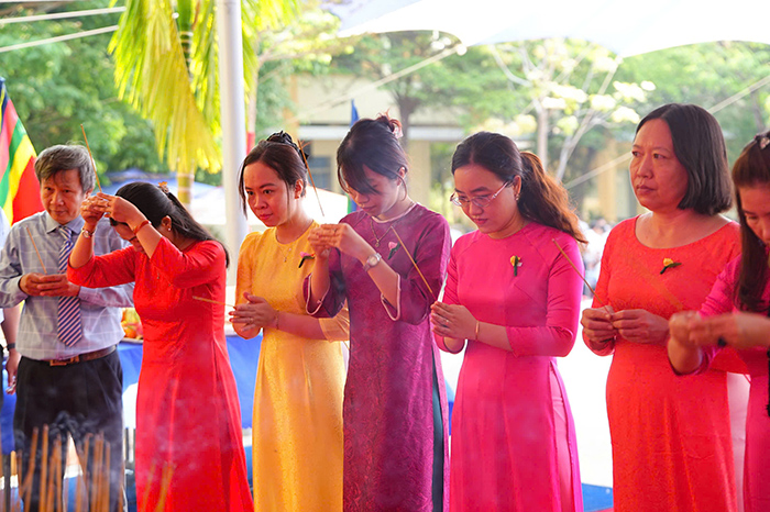 Sau phần ôn truyền thống, thầy và trò nhà trường thực hiện nghi lễ dâng hương, bày tỏ lòng thành kính đối với các vua Hùng.